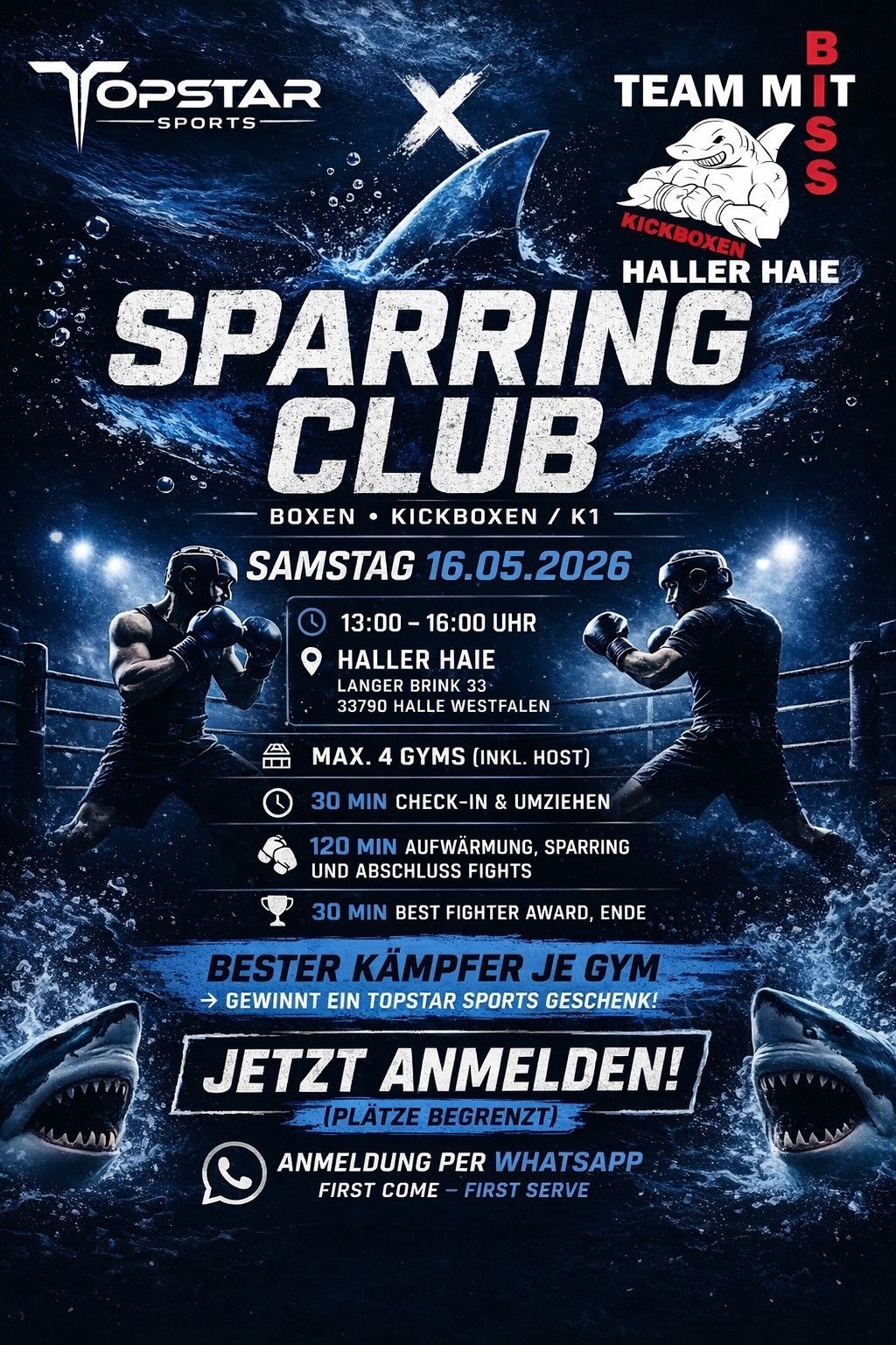 Sparring mit dem Topstar Sparring Club 📅 16.05.2026 🕐 13:00 – 16:00 Uhr 📍 Langer Brink 33, Halle Westfalen (33790) 🥊 Boxen • Kickboxen / K1 👊 max. 4 Gyms […]